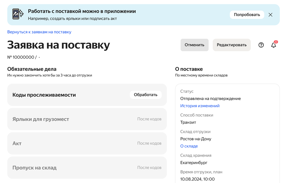 Загрузите обновленный файл на Маркет или, если в файле не потребовалось никаких изменений, нажмите Подтвердить и отправить. После этого отредактировать заявку будет нельзя. Скачать вашу версию файла можно будет на странице заявки на поставку в разделе Документы.