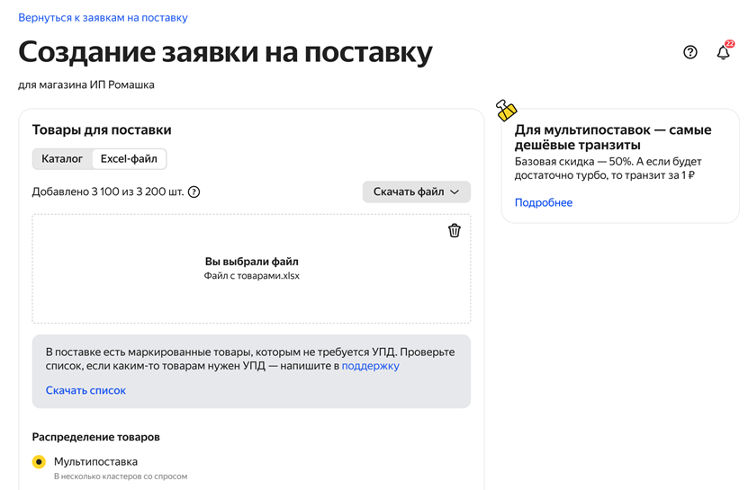 Если заметите ошибки в файле или при создании поставки — напишите службе поддержки в разделе Общение → Поддержка. Маркет исправит неточности и после этого вы сможете создать заявку заново.