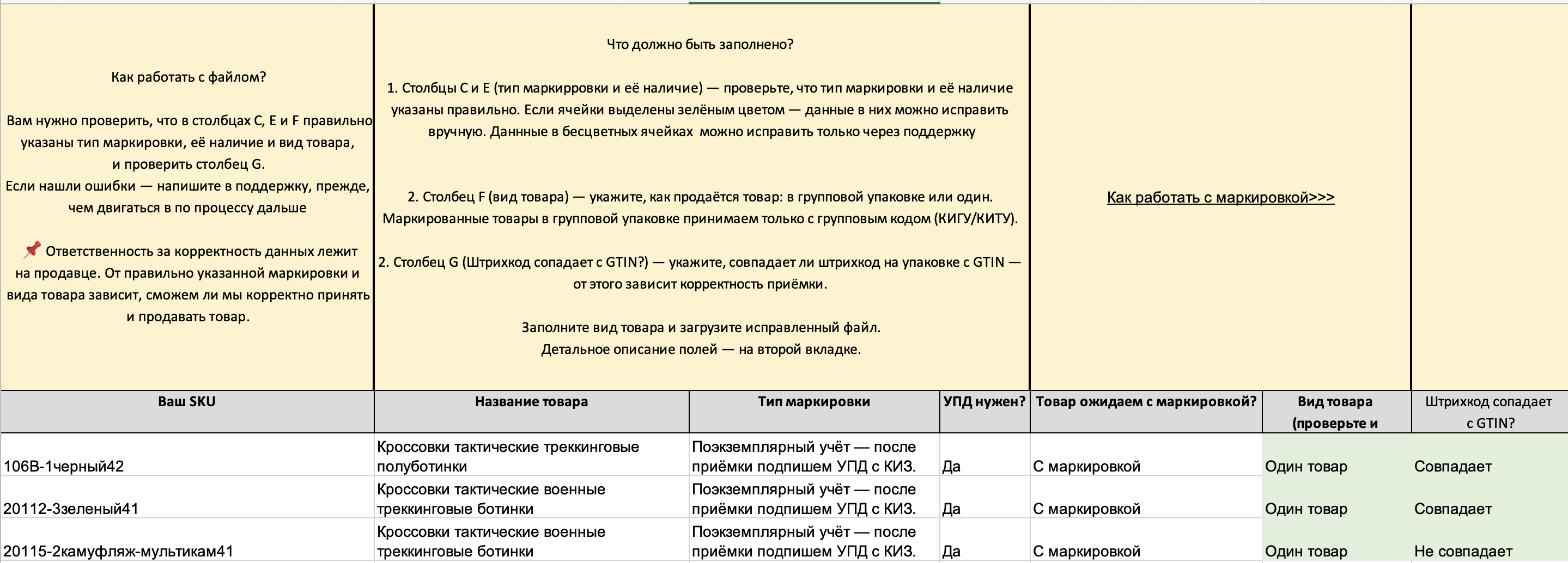 - Не совпадает, если они отличаются. В этом случае проверка на пересорт будет происходить уже после завершения приемки. Если обнаружится пересорт – товар попадет в брак, а коды маркировки будут исключены из шаблона УПД как некорректные. Чтобы исправить ошибку, обратитесь в поддержку – если подтвердится ошибка склада, Маркет примет такие товары в новой поставке. Проверить наличие пересорта можно в файле Коды маркировки после вторичной приемки.