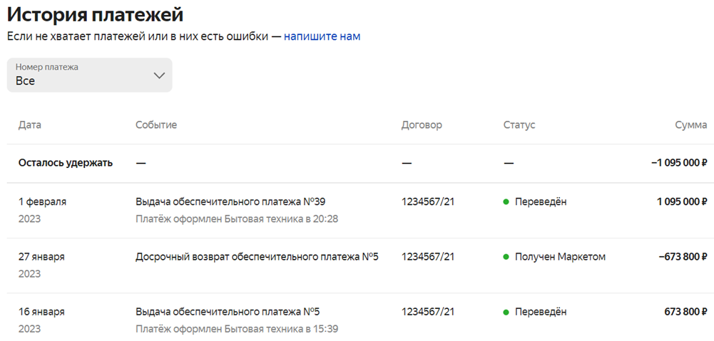 Услуга получится бесплатной, если вы перечислите Маркету весь платеж в том же месяце, в котором его получили. Чтобы погашение прошло вовремя, отправьте платеж за 4 рабочих дня до конца месяца. Маркет подскажет дату, до которой нужно вернуть обеспечительный платеж — ее можно найти в личном кабинете, на странице Финансы → Деньги в оборот → Вернуть досрочно.