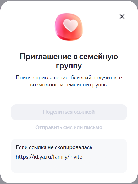 Если нажать Поделиться ссылкой, ссылка скопируется автоматически. Отправьте ссылку тому, кого хотите добавить в подписку. Если ссылка не скопировалась — скопируйте ее внизу окна с приглашением вручную.