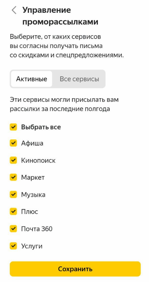 Yandex ID reklama havolalarini boshqarish bo'limida siz faqat Yandex xizmatlaridan bildirishnomalarni sozlashingiz mumkin. Qolgan bildirishnomalarni Yandex mail-da boshqarishingiz mumkin. Yandex mail yordam maqolasida ko'proq o'qing.
