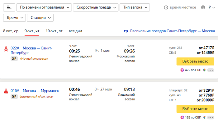 Чтобы купить билет, нажмите Выбрать место. Вы перейдете на сайт Яндекс Путешествий для оформления заказа.