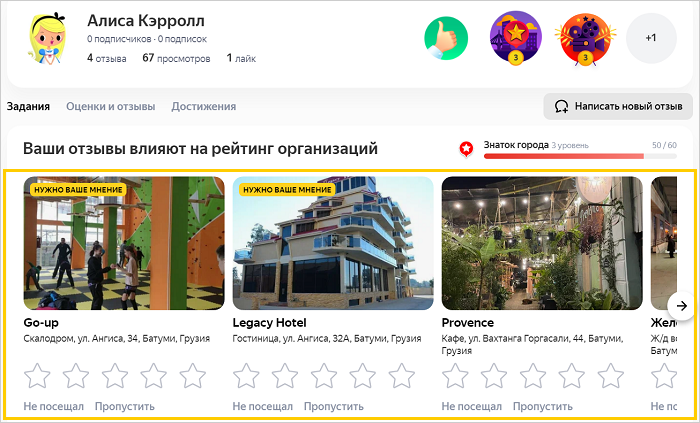 Вы можете оценить организации, фильмы и игры. За каждую поставленную оценку начисляется пять баллов, и ваш уровень на сервисе повышается. Кроме этого, на странице отображаются все оценки, которые вы выставили ранее в других сервисах Яндекса.