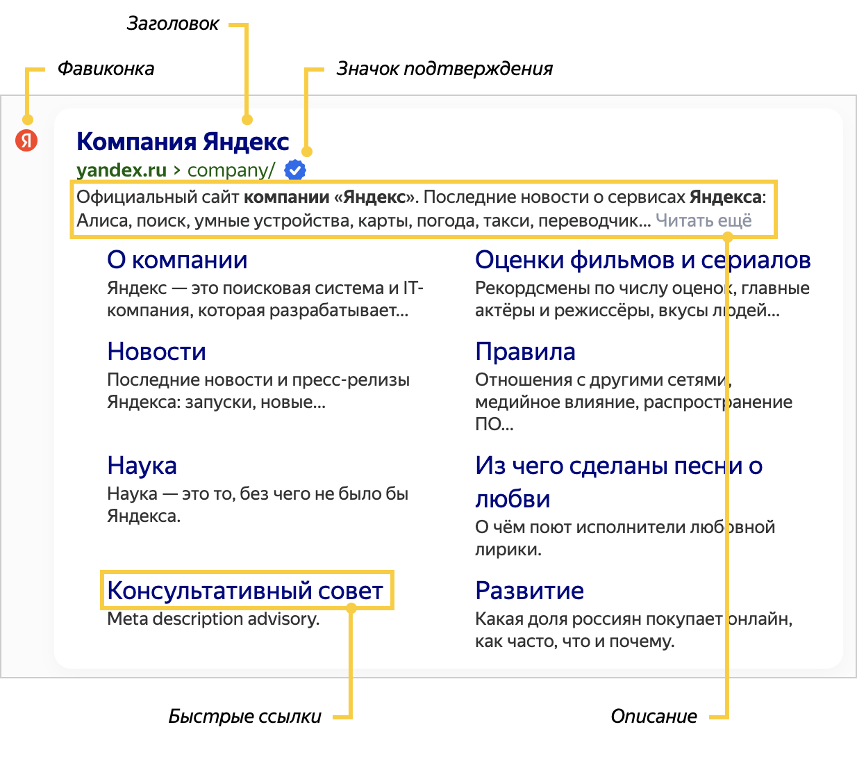 Подробнее см. раздел Сниппет в Справке Вебмастера.