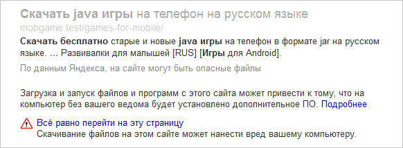Foydalanuvchilarning xavfsizligini taʼminlash uchun Yandex muntazam ravishda indekslangan saytlarda xavfli kod mavjudligini tekshiradi. Bunday kod aniqlangan taqdirda zararlangan resurs snippetida quyidagi ogohlantirish aks etadi: “Sayt kompyuter yoki mobil qurilmangiz xavfsizligiga tahdid solishi mumkin”.