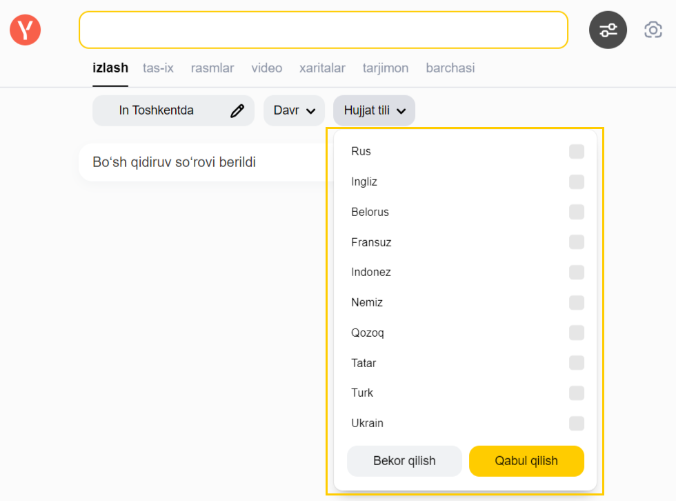 bosing. - Hujjat tili tugmasini bosing. Bir vaqtda bir nechta tilni tanlashingiz mumkin. Qidiruv natijalarida tanlangan tillardagi hujjatlar qoladi.