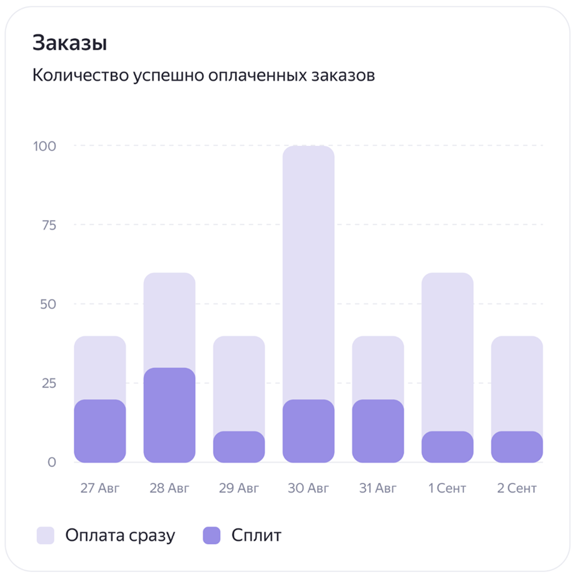 Можно просмотреть графики по заказам с полной оплатой и оплатой в Сплит.