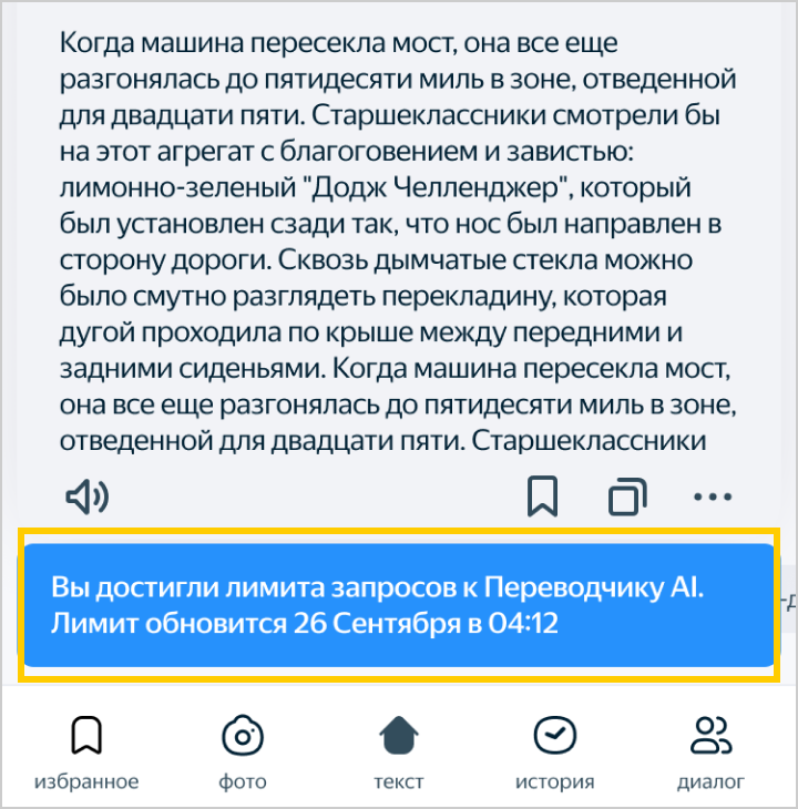 Модельде аудармаға сұрау саны шектелген. Егер лимит таусылса, экранның астында ол қайта қолжетімді болатын күн мен уақыт көрсетіледі.