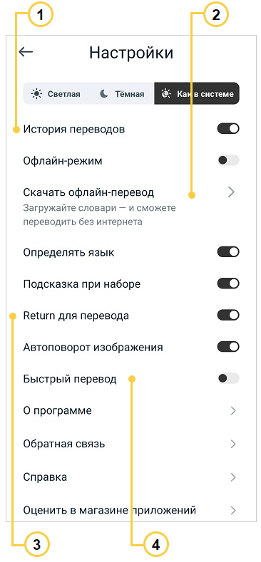 1 — tarjimalar tarixini qurilmada saqlash 2 — oflayn tarjima uchun til paketini yuklab olish 3 — kiritilgan maʼlumotni tasdiqlash uchun qatorni oʻtkazish tugmasidan foydalanish |