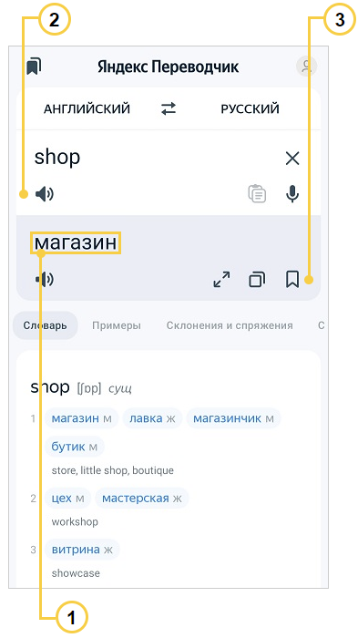 1 — Tarjimadan nusxa olish. Tarjima matnini bosing. Matndan nusxa olindi xabari qalqib chiquvchi oynada chiqadi. 2 — Matnni o‘qib eshittirish. Ovoz chiqarib o‘qish tezligini o‘zgartirish uchun yana 3 — Tarjimani saqlash. Matn Saralanganlar termasiga avtomatik kiritiladi. |