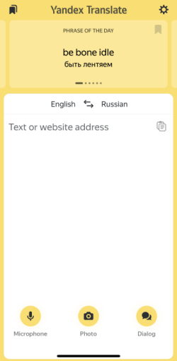 If the language of your device is Russian or English, the phrase of the day in the target language and a description of the app's new features are displayed on the Yandex Translate home screen. The phrases are updated daily.