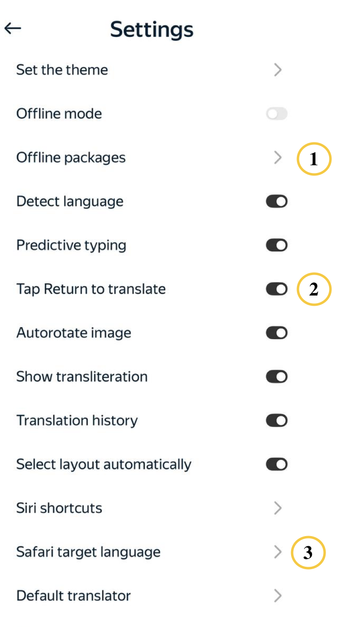1 — Download a language pack for offline translation. 2 — Use the line break key to confirm your input. 3 — Choose a language for translating websites with the Safari extension. |