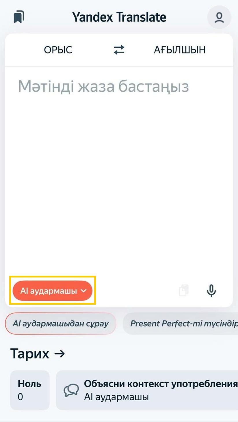 Құрылғы баптаулары арқылы қажетті тілдерге пернетақта қосыңыз. Егер қажетті пернетақта болмаса, оны AppStore арқылы жүктеп алыңыз. Сіз мәтінді енгізе бастаған кезде сервис тілді анықтап, сөздердің нұсқаларын ұсынады. Бірінші сөзді енгізгеннен кейін оның аудармасы көрсетіледі.