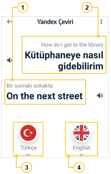 Seçtiğiniz dildeki yanıtlar küçük yazı tipiyle, muhatabınızın dilindeki yanıtlar ise büyük yazı tipiyle görüntülenir. Dillerin yerlerini takas etmek için dil seçimi ekranında simgesine tıklayın.