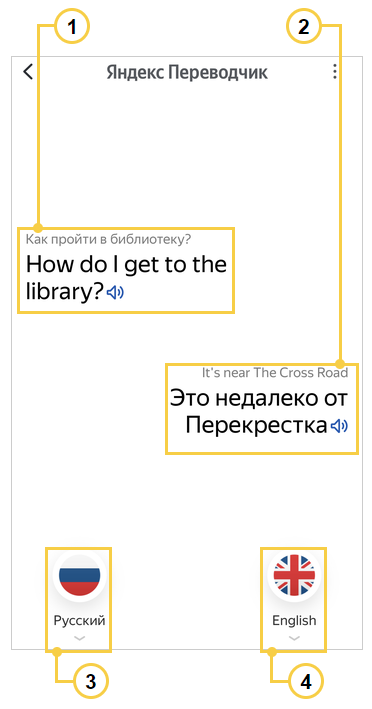 Tanlangan tildagi jumlalar mayda, suhbatdoshingiz tilidagi jumlalar esa — katta shriftda chiqadi. Tillar joyini almashtirish uchun tillarni tanlash ekranida belgisini bosing.