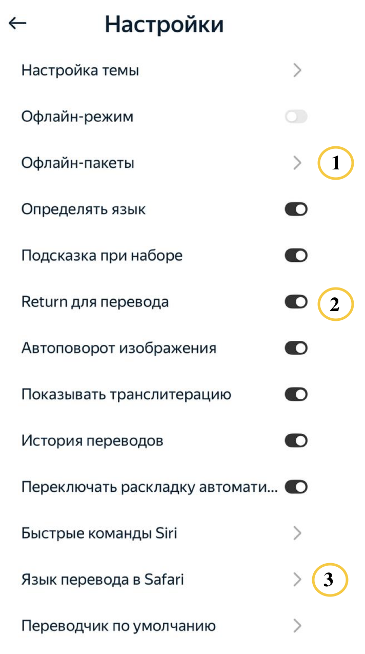 1 — oflayn tarjima uchun til paketini yuklab olish; 2 — kiritmani tasdiqlash uchun qatorni oʻtkazish tugmasidan foydalanish 3 — safari brauzeridagi kengaytma yordamida saytlar tarjimasi uchun tilni tanlash |
