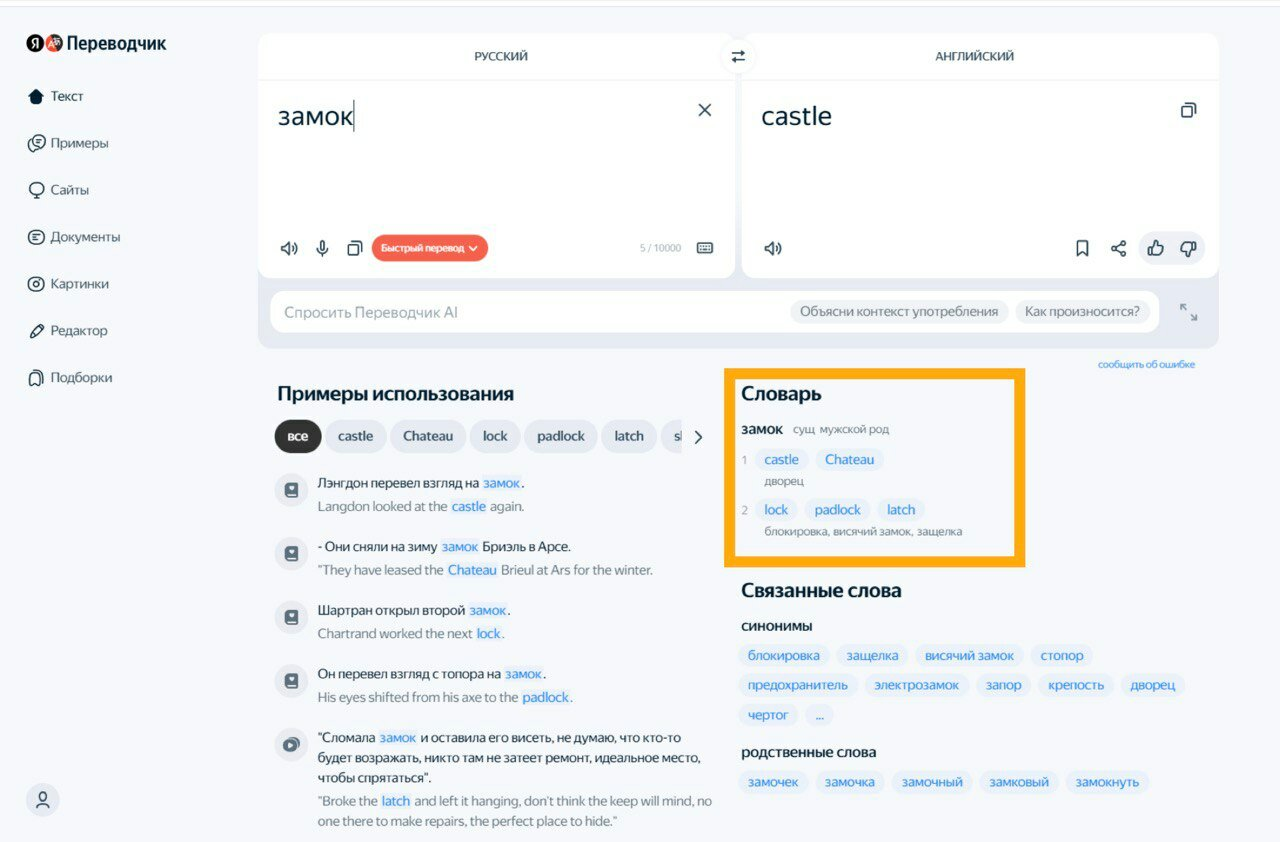 Также вы можете воспользоваться отдельной вкладкой с примерами. Это позволит вам не отвлекаться на другие элементы словаря и сосредоточиться только на примерах использования.