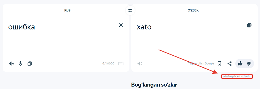 Yandex Tarjimon takliflaringiz tufayli yaxshiroq bo’lishi mumkin. Agar tarjimondan qulay foydalanishingiz uchun optsiyalar yetmasa, yaxshilashni chat orqali yoki quyidagi shakl yordamida taklif qiling.