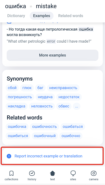 If you encounter any error in the translation or dictionary, you can report it directly from the site. To do this, click on the inscription Report incorrect example or translation at the bottom of the screen, select the desired element and click Report. You can also leave a comment.