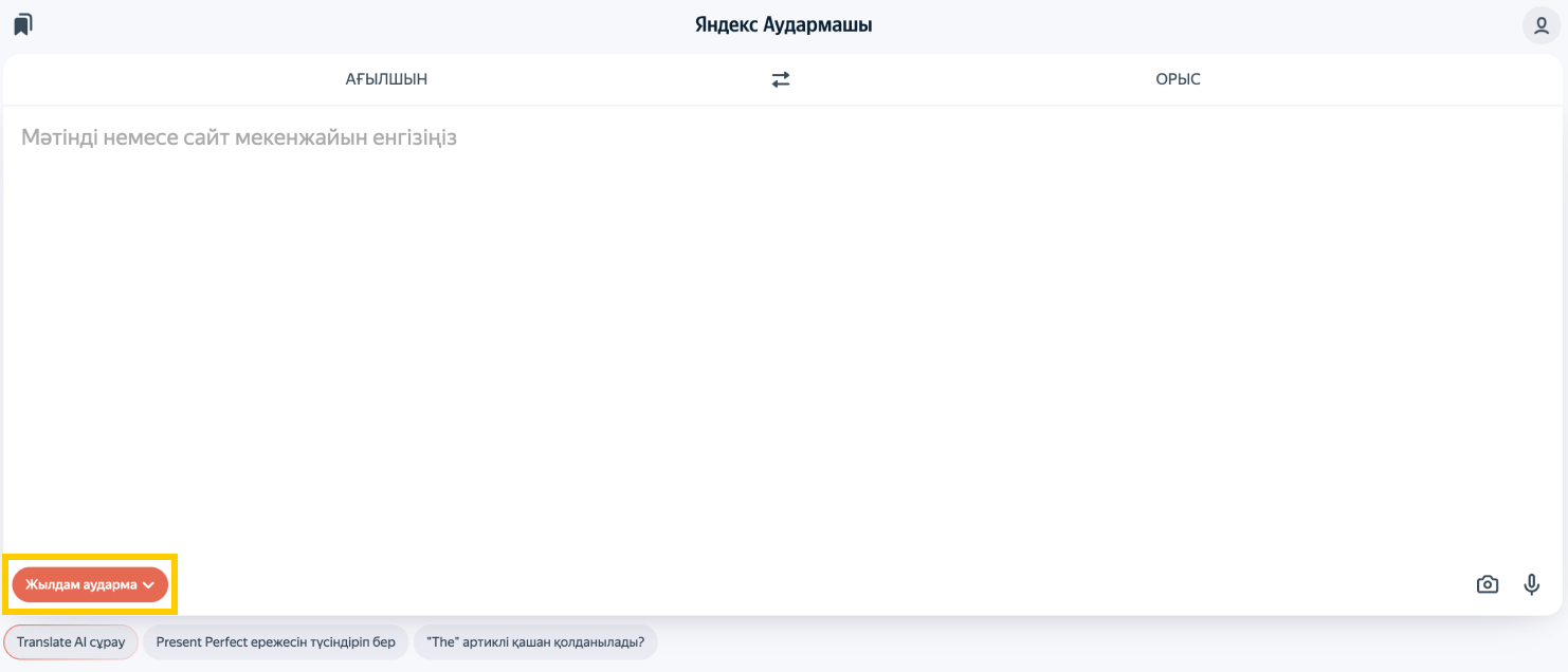 Егер Яндексте авторизациядан өткен болсаңыз, аударманы баптау үшін оң жақ жоғарғы бұрыштағы өз портретіңізге басыңыз. Егер авторизациядан өтпеген болсаңыз — таңбасын басыңыз.