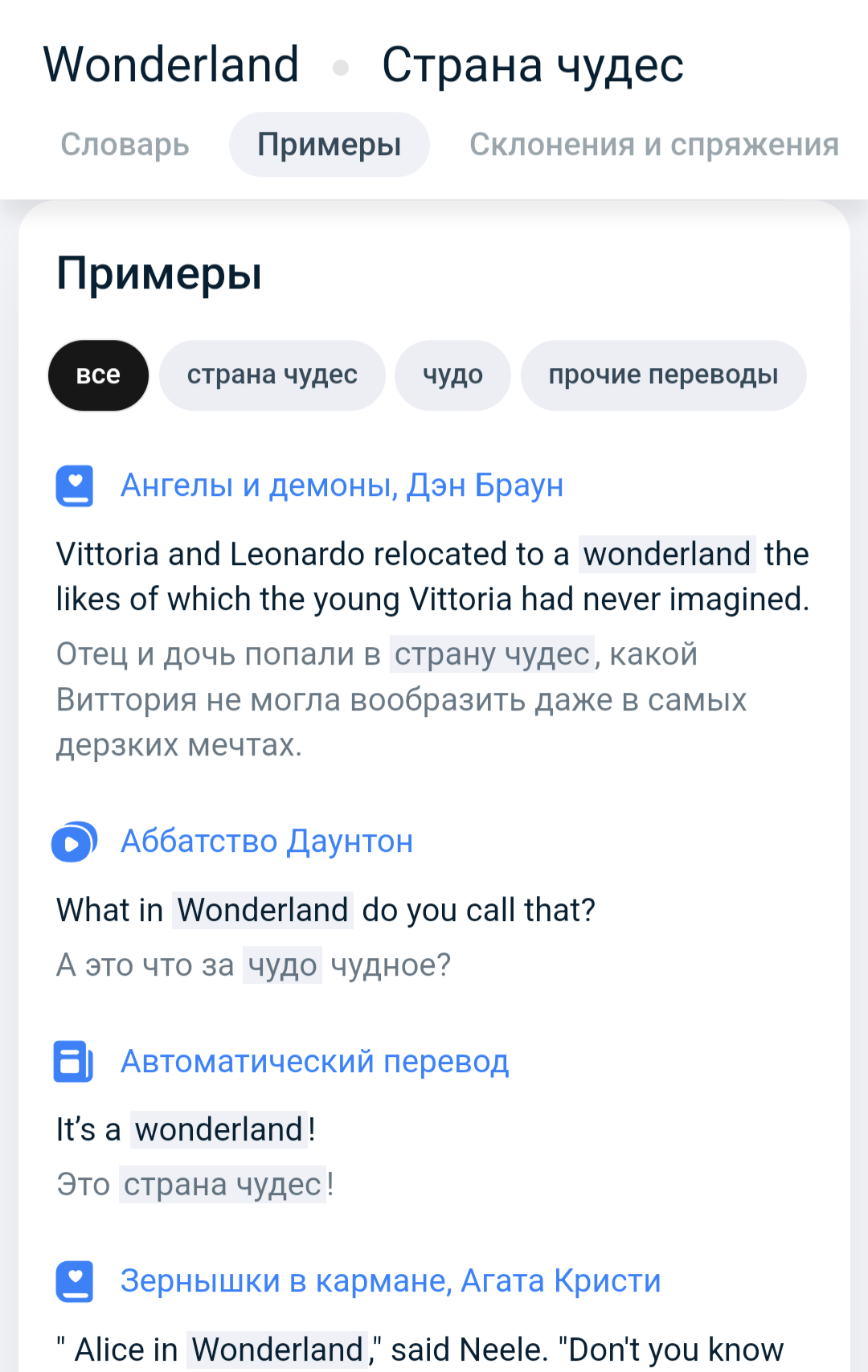 Чтобы посмотреть цитаты из книг и фильмов, в которых используется слово, в словарной статье перейдите на вкладку Примеры.