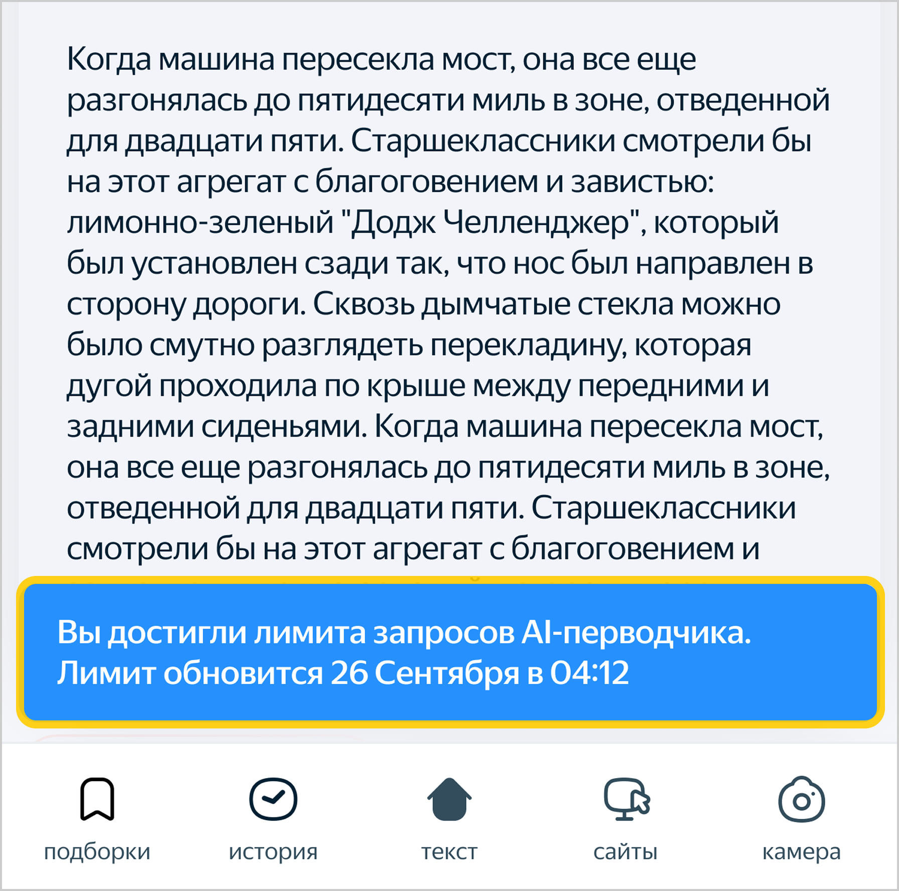 У модели ограничено количество запросов на перевод. Если лимит закончится, внизу экрана появится уведомление с датой и временем, когда доступ восстановится.