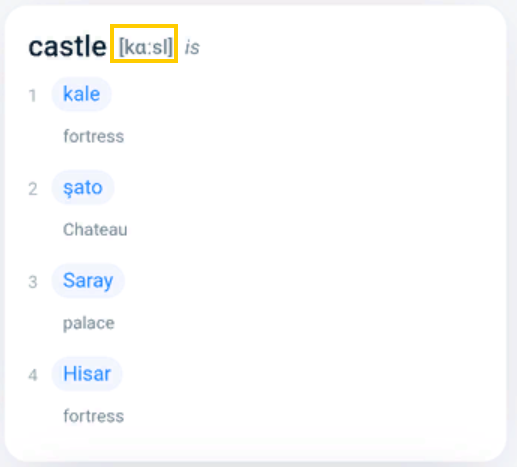 Sözlük girişleri çeviri metninin altında görüntülenir. Bazı diller için servis ayrıca şunları da sağlar: