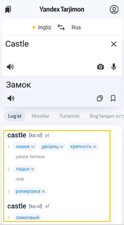 Lug‘at maqolalari tarjima matni ostida aks etadi. Xizmat shuningdek tanlaydi: