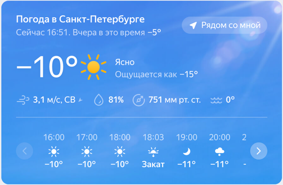 Сервис не хранит архив погоды, но вы можете узнать, какая температура была вчера. Температуру сутки назад показывает строка Вчера в это время, которую вы найдете на карточке погоды на главной странице сервисаглавной странице сервиса. Значение температуры рассчитывается с помощью технологии Meteum, которая учитывает данные ближайших метеостанций.
