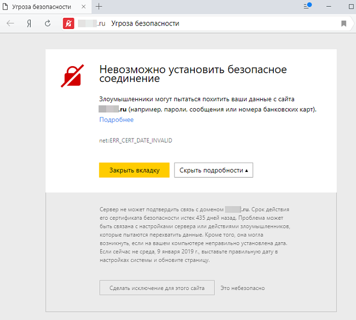 При проблемах с SSL-сертификатом браузер оповещает о них пользователя. Пользователь может не перейти на небезопасный сайт. Ниже представлен пример сообщения в Яндекс Браузере.