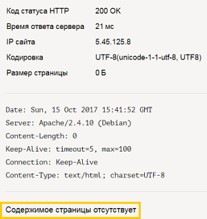 При проверке ответа сервера обратите внимание на блок Содержимое страницы. Если в нем отображается сообщение «Содержимое страницы отсутствует», в настройках вашего сервера проверьте: