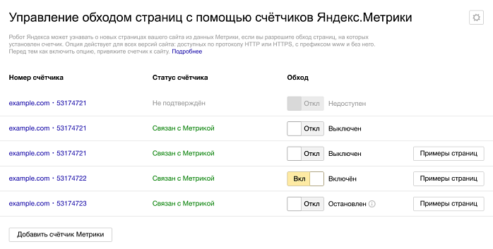 Чтобы проверить примеры, перейдите на страницу Индексирование → Обход по счетчикам и нажмите кнопку Примеры страниц напротив счетчика, к которому вы привязали сайт.