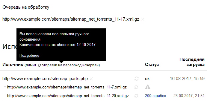Чтобы ускорить обход файла, нажмите значок . Если вы используете файл индекса Sitemap, можно запустить обработку каждого перечисленного в нем файла. Робот загрузит данные в течение трех дней. Использовать функцию можно до 10 раз для одного хоста.