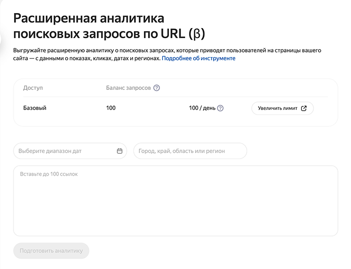 На странице Расширенная аналитика поисковых запросов по URL β укажите диапазон дат, регион и список URL вашего сайта, по которым нужна аналитика (по одному URL в каждой строке).