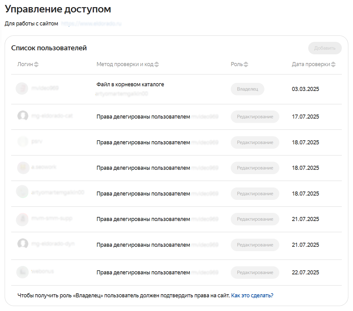 Когда вы подтвердите права на сайт, вы получите роль Владелец и полный доступ к управлению сайтом в Яндекс Вебмастере.