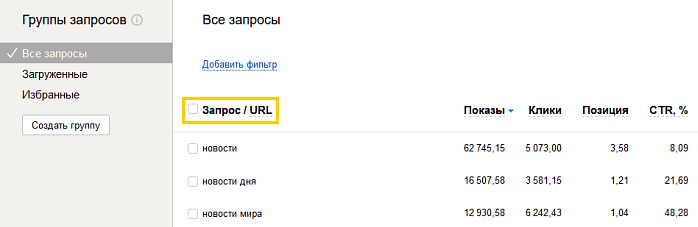 - Избранные — специальная группа. Позволяет отслеживать данные по отдельным запросам (например, отслеживать изменения позиций по ключевым фразам). Информация по каждому запросу из этой группы доступна на странице Статистика поисковых запросов.