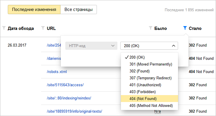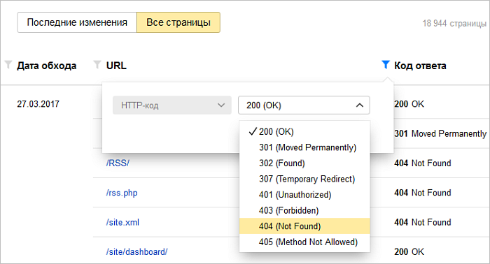Информацию о страницах и изменениях в поисковой базе робота можно фильтровать по всем представленным параметрам (дате обхода, URL страницы, коду ответа сервера) с помощью значка