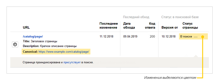дата последнего обхода страницы роботом и ответ сервера, полученный при этом;