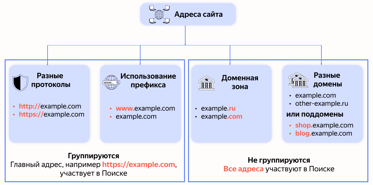 Один и тот же сайт в интернете может быть доступен по нескольким адресам. Например, с префиксом www и без него, по протоколам HTTP и HTTPS или на разных доменах.