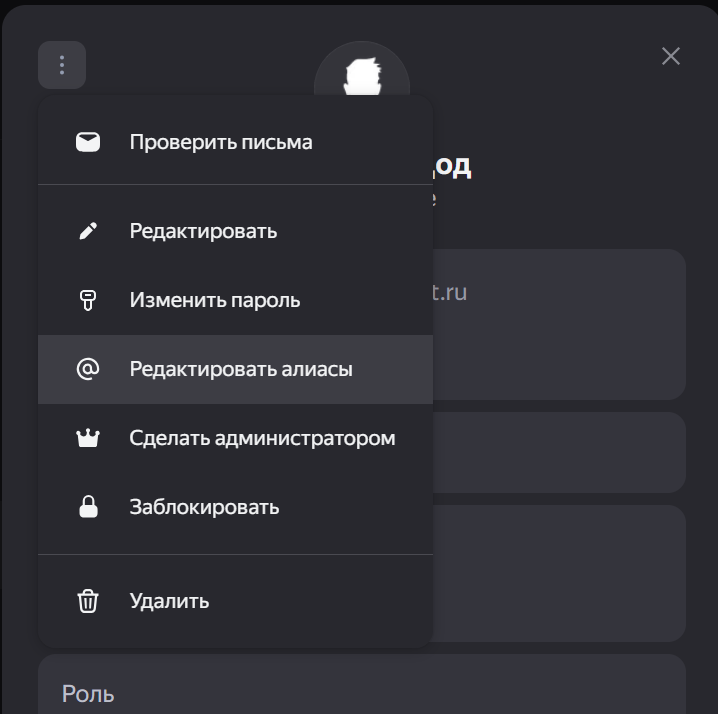 Нажмите на три точки в левом верхнем углу карточки сотрудника и выберите Редактировать алиасы.