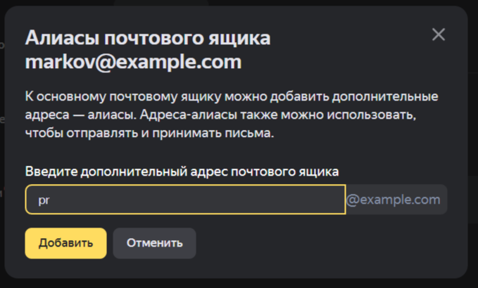 markov@example.com. Он работает PR-менеджером. Вы хотите, чтобы почта, отправленная на адресpr@example.com, приходила в его личный почтовый ящик.В таком случае вы можете добавить алиас