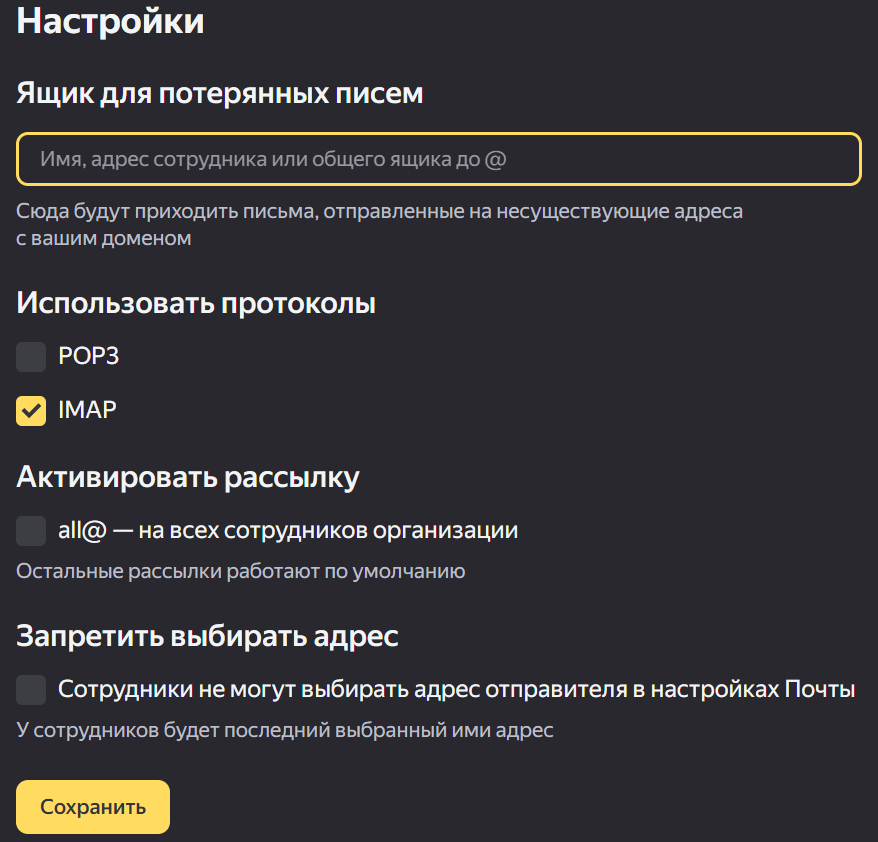 Обратите внимание: у каждого сотрудника в качестве единственного останется тот адрес, который был выбран в настройках Почты в момент введения запрета. Изменить его можно будет только по API с помощью запроса POST org/{orgId}/mail/users/{userId}/settings/sender_info (документация).