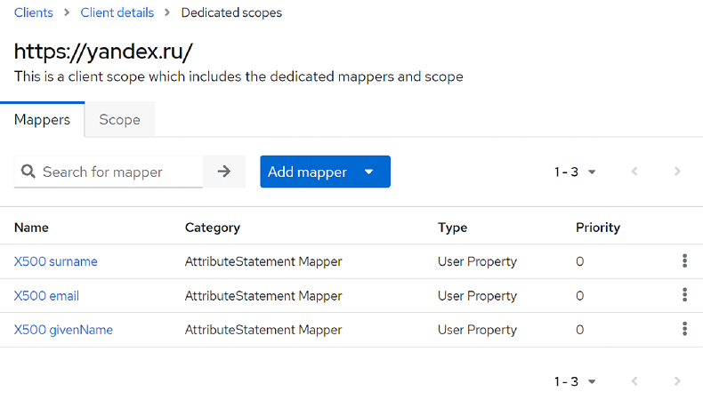 На вкладке Client scopes откройте Client scope, который соответствует создаваемому клиенту, например