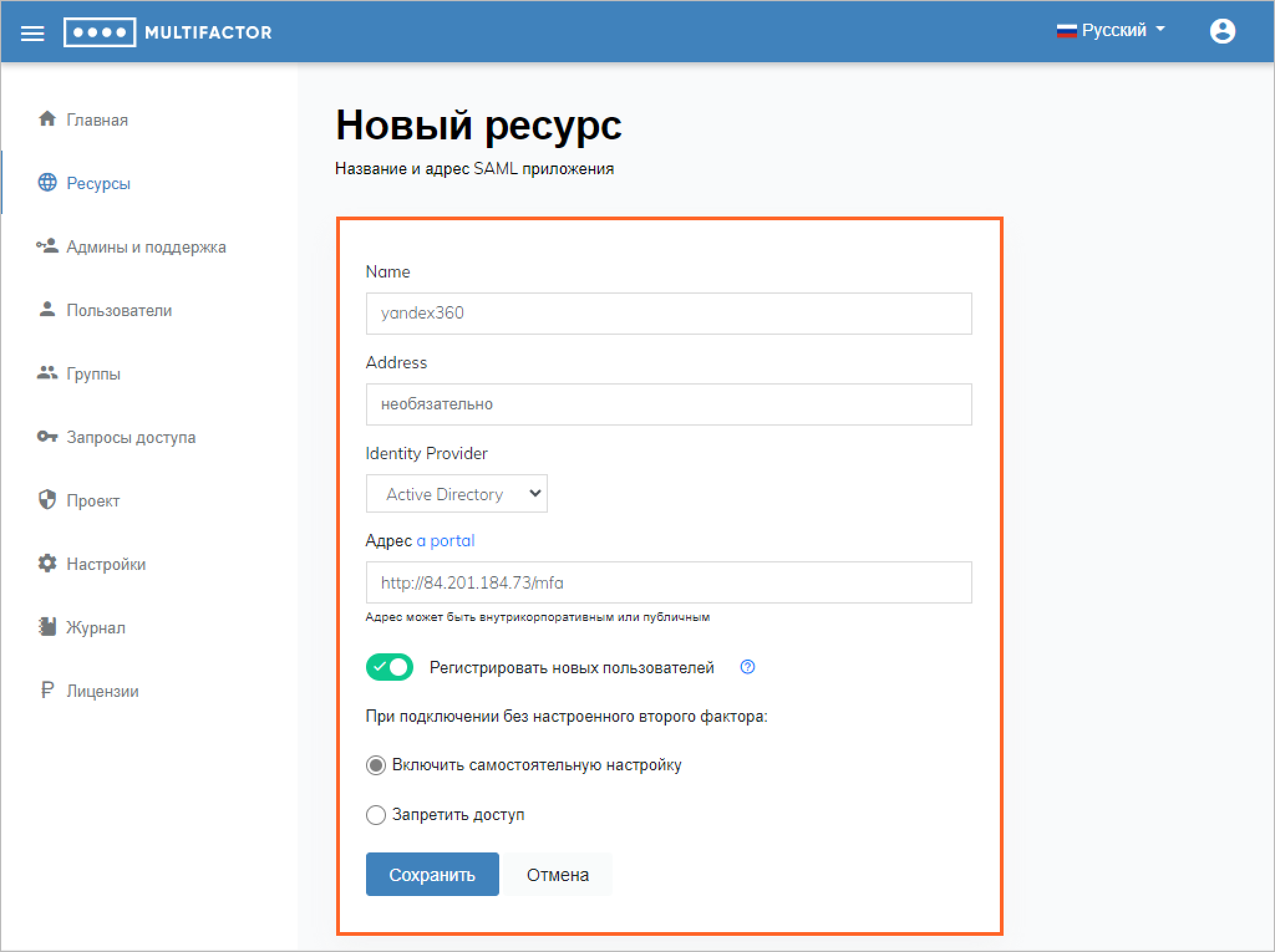 Чтобы организовать единый вход (SSO) в сервисы Яндекс 360 через Multifactor, нужно предварительно настроить портал самообслуживания Multifactor и создать SAML-приложение.