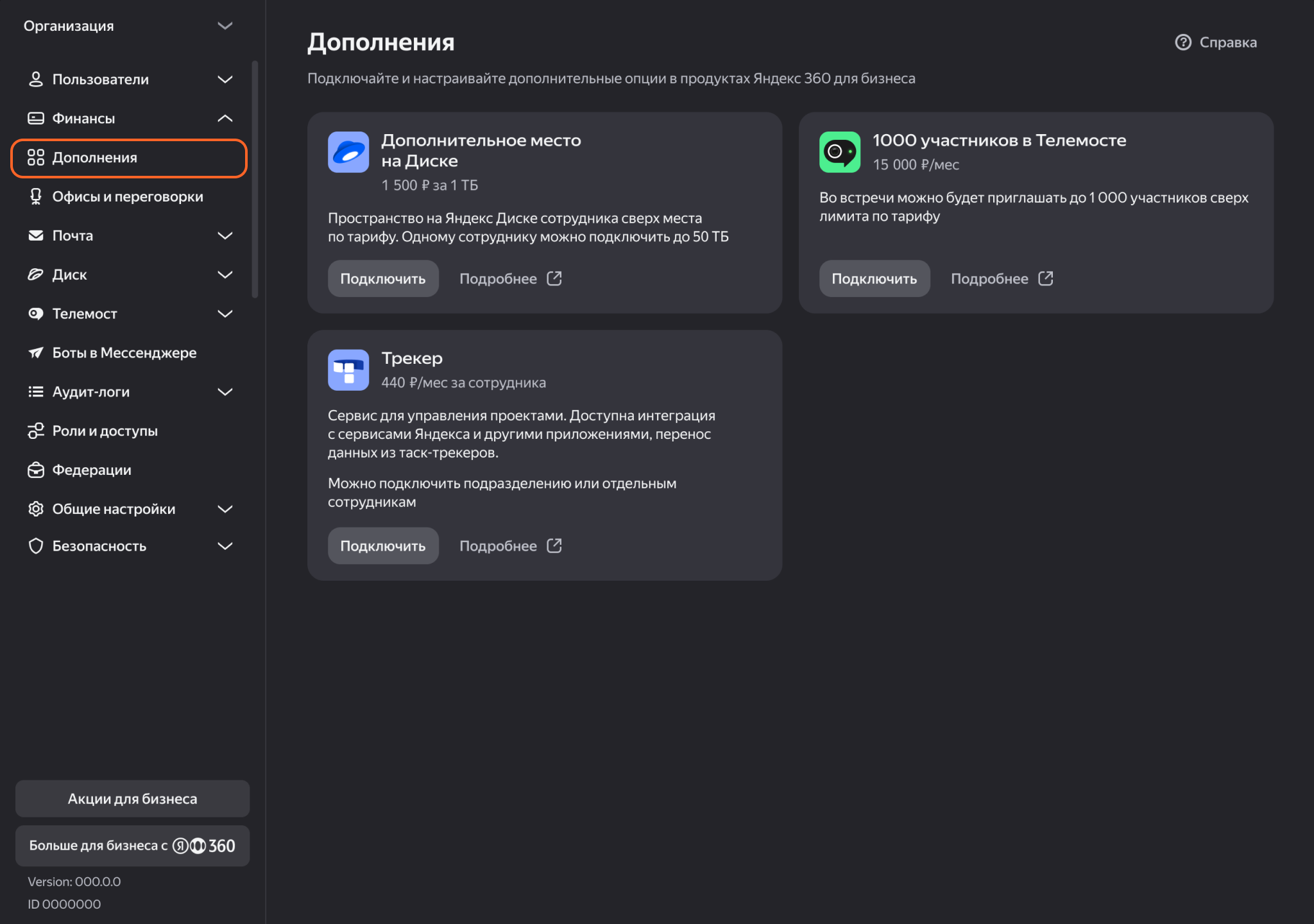 Подробнее о доступных дополнениях и их подключении — в Справке по тарифам и оплате.