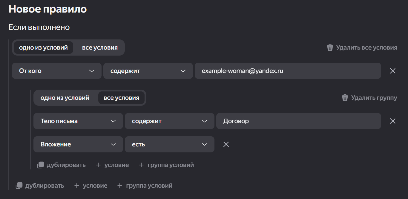 Masalan, xodimga hamkasblaridan, kompaniyaning muayyan mijozidan xatlar keladi, shuningdek, u barcha mijozlarning shartnomalar haqidagi savollariga javob beradi (agar xatda fayl ilova qilingan bo‘lsa). Xodim ta’tilga chiqadi va siz qoidalarni shunday o‘rnatmoqchisizki, kompaniyaning muayyan mijozidan kelgan xatlar, shuningdek, shartnomalar bo‘yicha savollar boshqa xodimga yuborilsin. Buning uchun bitta oddiy shartni, shuningdek, guruhga birlashtirilgan ikkita shartni qo‘shish kerak:
