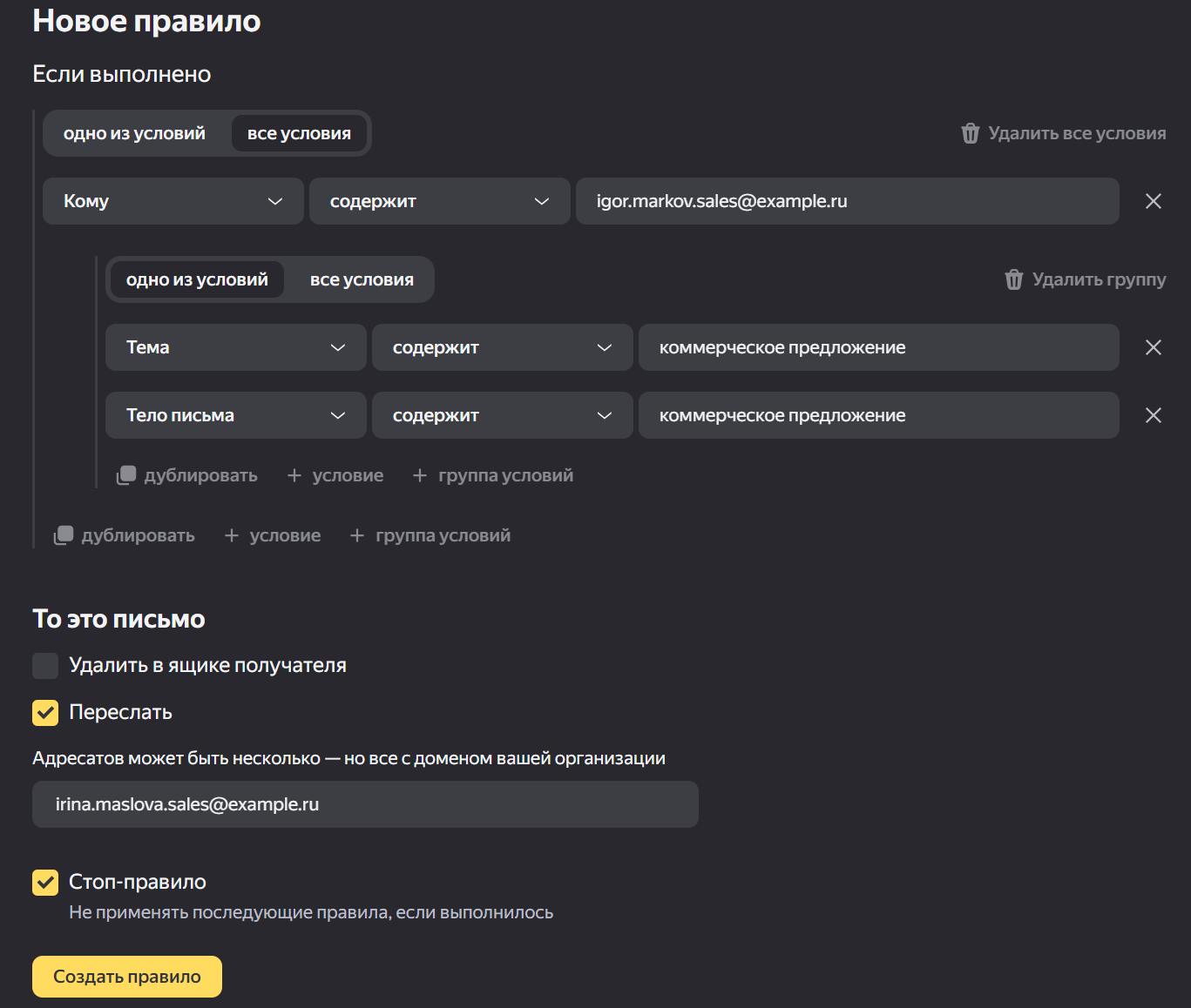 Masalan, xodim hamkasblaridan xatlar va kompaniya mijozlaridan tijorat takliflarini oladi. Uning ta’tilida boshqa hamkasbiga faqat tijorat takliflarini yuborish uchun bir vaqtning o‘zida bajariladigan ikkita shartni sozlang: