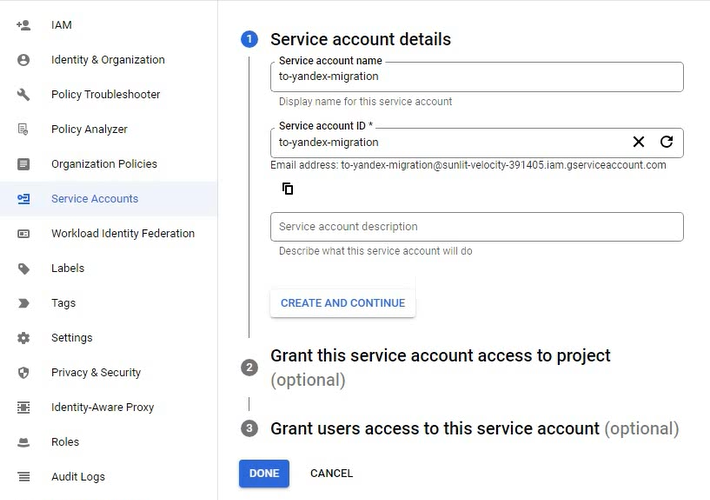 Maxfiy fayl kirish kalitiga ega fayldir. Uning yordamida Biznes uchun Yandex 360 Google Workspace bilan bog‘lanadi. Uni tayyorlash uchun Google Workspace xizmat hisobini yarating, keyin yangi sir yarating va uni faylga saqlang.
