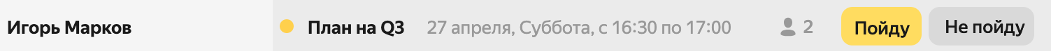 Чтобы принять приглашение, нажмите на событие левой кнопкой мыши в сетке календаря, а затем кнопку Пойду.